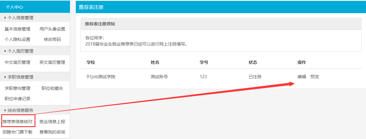 如果状态为“已注册”,说明学校尚未审核,点击“编辑”,进入推荐表编辑页面,修改,重新提交即可。